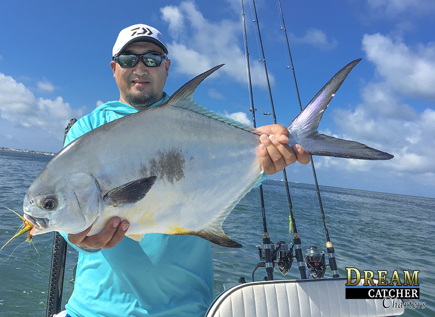 Fishing with Capt. Brian "Goose" of Dream Catcher Charters. Takeshi puts a nice permit on the board.